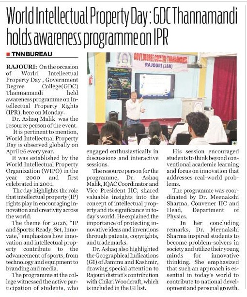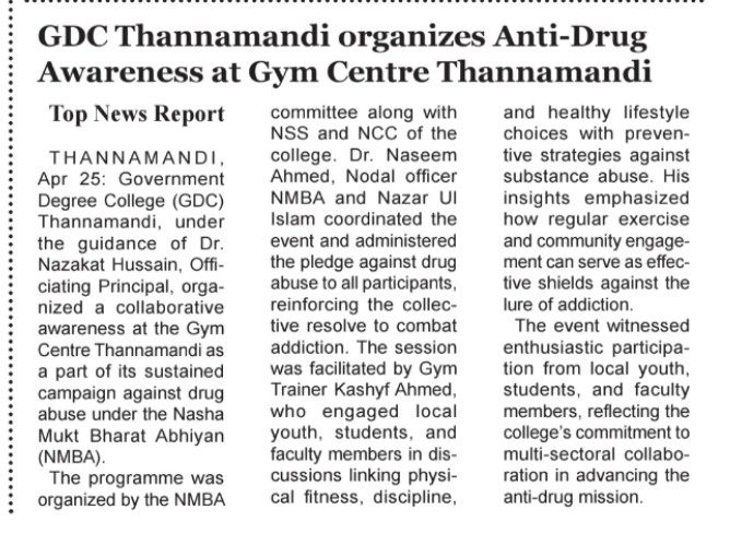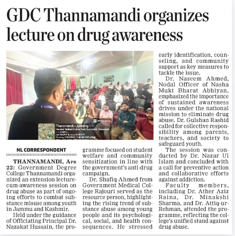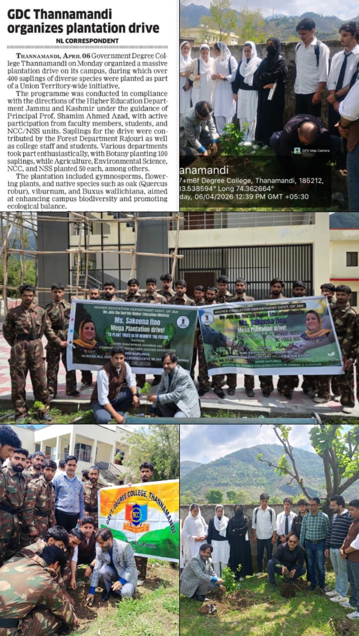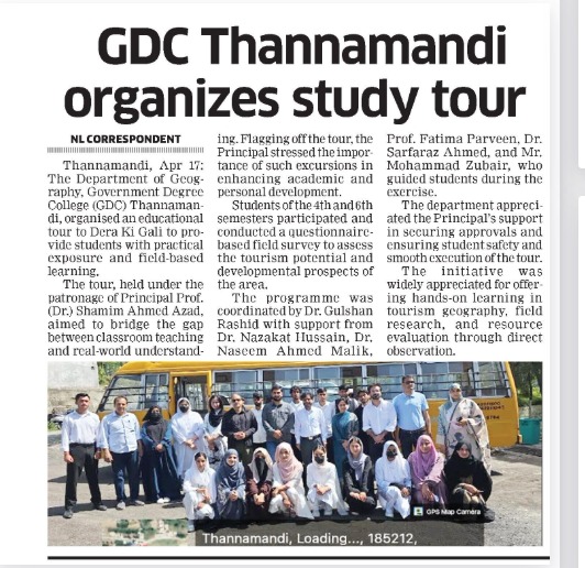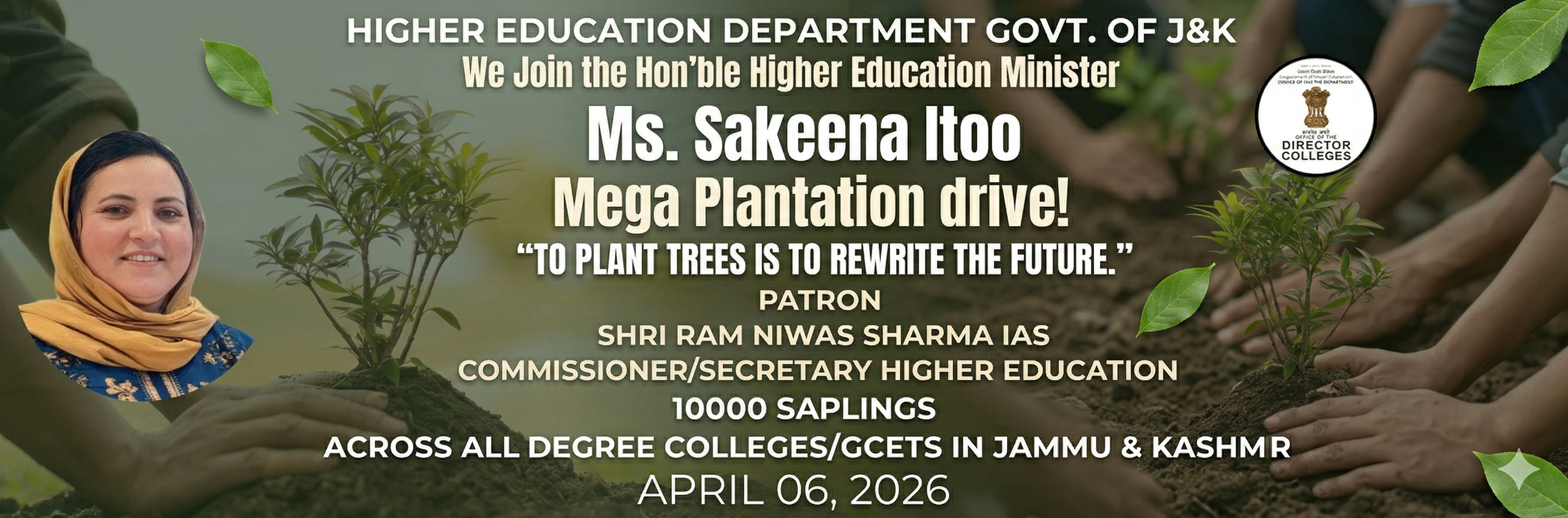 Welcome to Government Degree College Thannamandi, Rajouri, an esteemed institution committed to academic excellence, holistic development, and the empowerment of young minds in the Union Territory of Jammu and Kashmir. In 2010, the College got affiliation with UGC under section 2(F) and 12(B). It has also been granted permanent affiliation with University of Jammu and NAAC Accreditation with B-Grade CGPA 1.96. Keeping in view the vision of the college (wedded to quality education and high moral values), efforts are being made to produce upright and competent individuals so that they can fit themselves in the present transparent, competitive, technical, digital era of the modern world. At Government Degree College Thannamandi, we strive to create a vibrant learning environment that nurtures intellectual curiosity, critical thinking, and ethical values among students. Our college stands as a center of quality higher education in the Pir Panjal region, dedicated to shaping responsible citizens and future leaders through innovative teaching, co-curricular engagement, and community outreach. We believe that education is not merely the acquisition of knowledge but the overall development of personality, character, and social responsibility. The college has established the Science Club, Literary Club and also has college magazine “The Flight” where students are being provided opportunities to show their hidden talent and display their creativity in addition to regular publication of college Newsletter “The Shahdara” and Admission Brochure. College has also established the Women Development Cell and an Internal Complaint Committee to provide equal opportunities to female students and faculty of the college for progress. The college continuously endeavors to provide a supportive academic atmosphere with dedicated faculty, well-structured academic programmes, and a range of extension activities through NSS, NCC, cultural, literary, and sports initiatives. Our institution places special emphasis on inclusive education, skill development, environmental awareness, and the promotion of national values in alignment with the vision of higher education in the Union Territory of Jammu and Kashmir. We encourage our students to participate actively in academic pursuits, research, community service, and extracurricular activities to realize their full potential. I am proud of the achievements of our students, faculty, and staff who work tirelessly to uphold the academic standards and reputation of the college. Together, we are committed to fostering a culture of discipline, innovation, and excellence. I extend my best wishes to all students and stakeholders and invite you to be a part of the academic journey of Government Degree College Thannamandi, Rajouri, as we continue to strive for excellence in higher education and nation-building. |